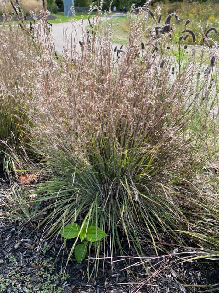 The planting includes coreopsis, spiderwort, butterfly weed, whorled milkweed, button blazing star, purple prairie clover, aromatic aster, New Jersey tea, meadowsweet, and little bluestem.  Other native grasses – side oats grama, purple lovegrass, and prairie dropseed – were planted in groups to highlight their beauty and suitability for the home landscape. Each grouping of native plants has a small sign providing the botanical and common names of the plants.